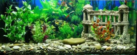 Если вы предпочитаете солнечный блеск, перламутровые пляжи, теплую голубую лагуну, то аквариум для вас – морской, или рифовый, если забыть о его стоимости. Кроме множества цветных рыбок, суетящихся прямо перед вашими глазами, в нем могут быть актинии, иглокожие, мягкие и твердые кораллы, даже хищные рыбы и креветки. Более простой вариант – псевдоморской аквариум с пресной водой и использованием украшений: рифа из безвредного для рыб латекса, пластиковых камней, раковин моллюсков, блестящих предметов, сымпровизированных руин или затонувших кораблей. Очень эффектен красноватый свет от рифа, который достигается применением красной подсветки. А если вас притягивают холодные глубины, то можно создать и темно-синий цвет воды.