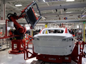 Робот приделывает дверь к автомобилю на заводе в Калифорнии. Фото: Paul Sakuma / AP