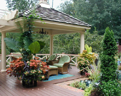 Навесами называют конструкции, занимающие промежуточное положение между беседкой и перголой. Это легкие стационарные постройки, защищающие от атмосферных воздействий и солнца. Как правило, они имеют прямоугольную форму и открыты с одной или трех сторон. Если навес имеет боковые стенки, то изготавливают его обычно из деревянных решеток. Растения вертикального озеленения, вьющиеся по таким решеткам, украсят навес, объединяя его с окружающим ландшафтом, и дополнят садовую композицию.