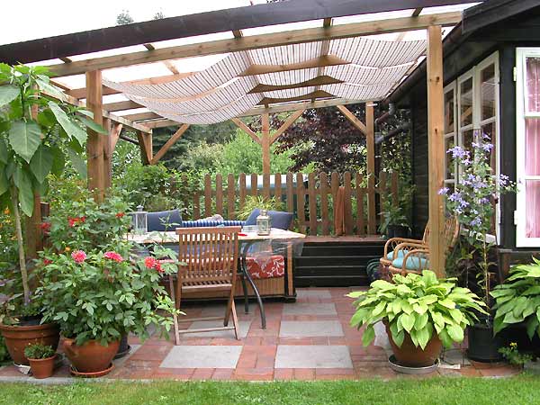 Навесами называют конструкции, занимающие промежуточное положение между беседкой и перголой. Это легкие стационарные постройки, защищающие от атмосферных воздействий и солнца. Как правило, они имеют прямоугольную форму и открыты с одной или трех сторон. Если навес имеет боковые стенки, то изготавливают его обычно из деревянных решеток. Растения вертикального озеленения, вьющиеся по таким решеткам, украсят навес, объединяя его с окружающим ландшафтом, и дополнят садовую композицию.
