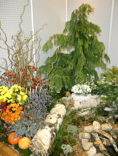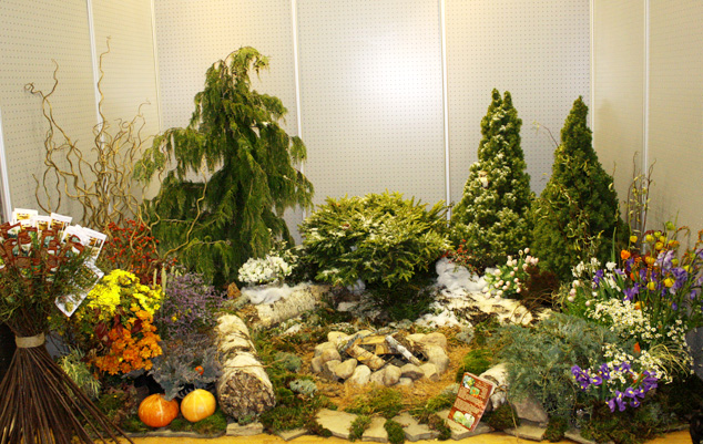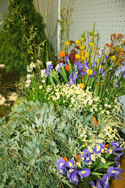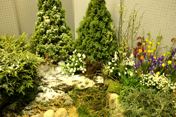 Привлекательность композиции в том, что ее с успехом можно создать в саду. Мы использовали здесь хвойные растения – Кипарисовик, Ели (Коника, Нидиформис), стелющиеся можжевельники, которые формируют основу, задний план цветника.