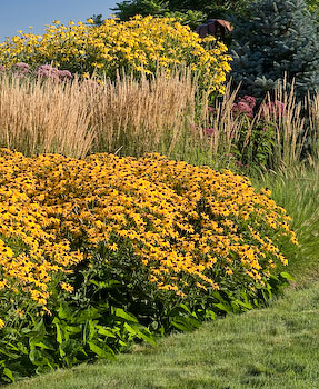 Клумбы с голубыми многолетниками создают иллюзию простора. Голубые мазки способны придать клумбе глубину и подчеркнуть контрастность желтых и оранжевых тонов. Желтый в соседстве с голубым выглядит ярче. Можно даже добиться эффекта тени, засадив широкую рабатку голубыми цветами.