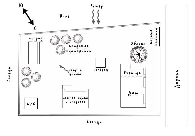 На первом выезде производятся замеры границ сада и имеющихся строений, фотосъемка, определение сторон света и предварительная оценка качества почвы. Как правило, этого достаточно, чтобы приступить к проектированию.