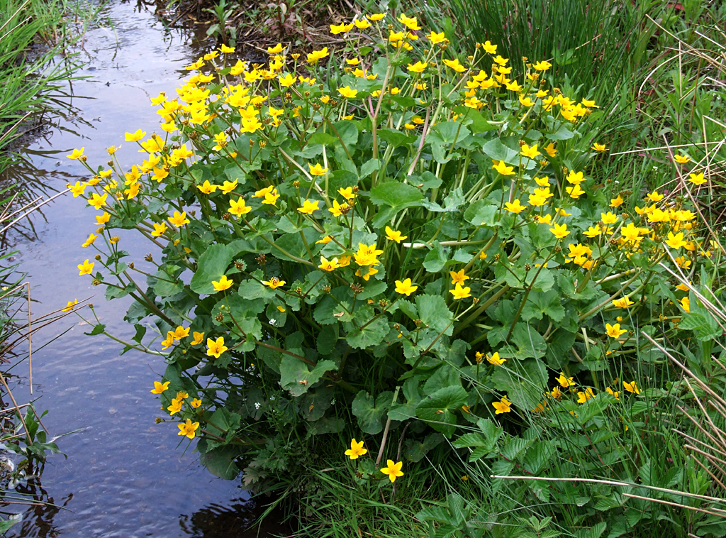 Влажные и заболоченные места охотно покрывает калужница болотная с ее мясистыми листьями. С апреля по май места ее обитания бывают подернуты золотистой пленкой, словно Златовласка распустила свои волосы. Некоторые сорта обладают махровыми и от этого еще более эффектными цветками. Вместе с розовой примулой она превращает в мае влажные берега в полотно незримого художника. Яркая розовая окраска цветков примулы появляется еще до зеленых листочков. Прекрасно чувствует себя среди них белоцветник весенний, приветствующий весну своими элегантными белыми колокольчиками в мае.