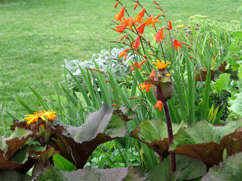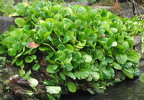 Для обсаживания прибрежной зоны, выбирают такие растения, которые производят впечатление пышной растительности на влажном берегу. Такие растения по своим листьям, цветкам и габаритам должны напоминать болотные растения. Они темно-зеленой окраски, с сочными, грубыми листьями, как бадан, разновидности посконника, а из любящих полутень – драмера щитовидная и роджерсия. |