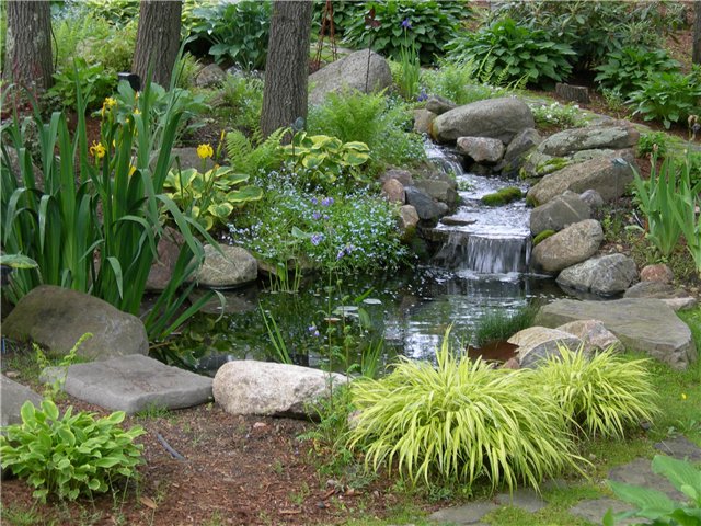 Из больших и пышных растений выбирайте ирисы болотные, бузульники, роджерсию, папоротники, астильбы, волжанку, лилейники. Ими хорошо декорировать истоки, водопады и каскады, когда сочные, зеленые листья эффектно подчеркивают камни.