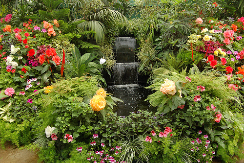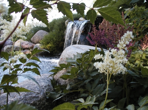 Если вы запланировали небольшой водопад из камней, то в качестве фона для него можно посадить крупные растения - бузульники, роджерсию, папоротники и болотные ирисы, чтобы естественно замаскировать каменистую кладку, и придать более живой природный вид водного источника.