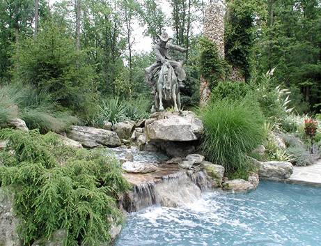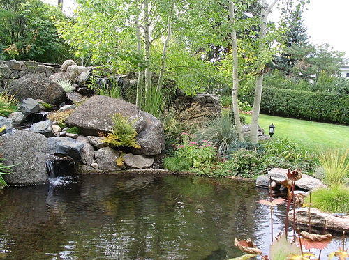 Природный пруд часто сопровождается такими декоративными элементами как водный каскад или водопад. |