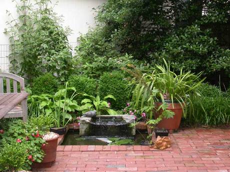 Водоемы прямоугольной или квадратной формы можно примкнуть к стене увитой плетистыми растениями или к ширме. Интересно, если на него «нависают», декоративные растения с красивой листвой, вроде папоротников, хост, или бузульника.