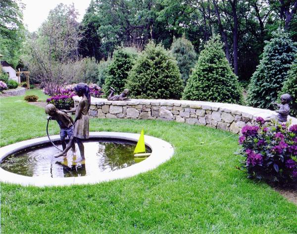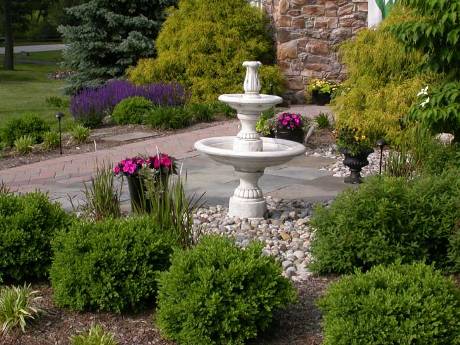 Водоемы правильной формы часто украшают фонтанами с различными насадками, фигурами, кувшинами и вазонами с вытекающей из них водой, которые можно разместить на бортике. Или классическим фонтаном, из нескольких чаш, размещенным в центре.
