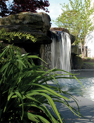 Водопад это уступ, с которого ниспадает вода. Высота падения воды зависит от высоты ступени. Насос погруженный в водоем поднимает воду на самую верхнюю часть водопада, где располагается накопительная емкость. По мере ее заполнения водяной поток по плоскому природному камню широкой полосой устремляется в водоем.