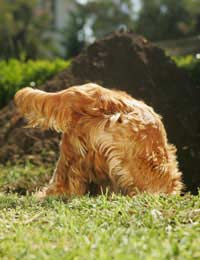 Собака роет яму, для того чтобы поймать крота или мышку, чтобы устроить себе прохладное местечко, или инстинктивно строит логово для потомства. А иногда она это делает из простого любопытства, для собственного удовольствия или даже, чтобы подражать человеку, копающему в саду. Вы можете установить специальные шумящие предметы для отпугивания кротов и полевых мышей, чтобы у собаки не было повода охотится за ними на вашем участке.