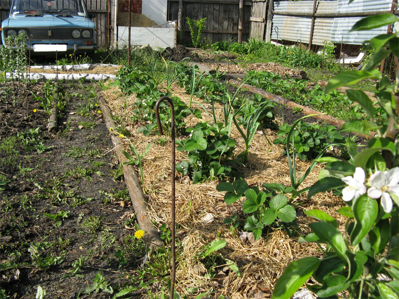 Проходя, как-то утром мимо делянок с садовой земляникой, об этом ниже опишу, обратил своё внимание на то, что некоторые соломинки и листья стоят торчком, значит вертикально. Я специально, усиливая контраст, раскладываю тонким слоем в земляничные делянки солому. Представьте себе, уважаемый читатель, на ярко жёлтом фоне, огромные тёмно-зелёные листья, а над ними крупные бело-жёлтые цветы и маленькие красные «яблочки». Я и сам обалдел, когда это сотворил.