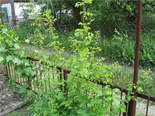 Южный забор дачи обтянул сеткой-рабицей, и солнце беспрепятственно проникает сквозь неё, и опора для кустов винограда и ежевики.