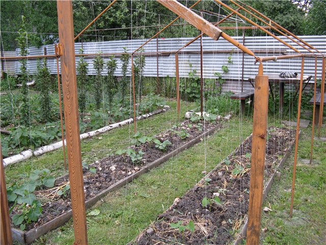 Возводится оно для поддержания определённого микроклимата той или иной культуры. Да и требуется теплица только на ранневесенний или позднеосенний период. Так как мы с Вами ведём дачное хозяйство, по пути наименьшего сопротивления, то есть по законам природы, не создаём искуственно себе проблем, чтобы потом их не пришлось решать, поэтому я использую каркас для натяжения верёвочных шпалер, снизу до верху, и только.