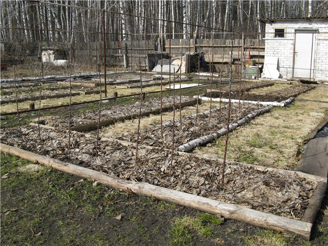 Садовой землянике отвёл самое солнечное место, в центре дачи. Для лиановидных и плетистых, в том числе для кустов винограда, соорудил шпалеры из старых водопроводных труб. Натянул проволоку по всей длине шпалер.