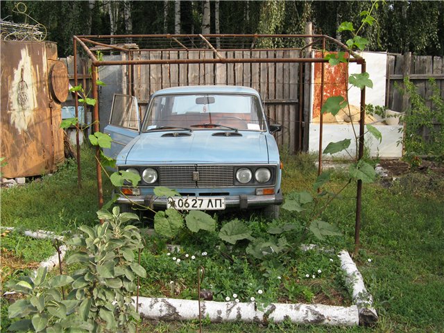 Места общего пользования распределил так. В заборе с северной стороны, выпилил проём и забетонировал ворота для заезда автомобиля. Под авто отвёл площадь 2х5 метров. Сварил над этой площадкой шпалеру-каркас, всё из тех же старых водопроводных труб, для зимостойкого сорта винограда. Машину притенять будет, урожай приносить немалый и укрывать его не надо, пусть заплетает весь каркас.