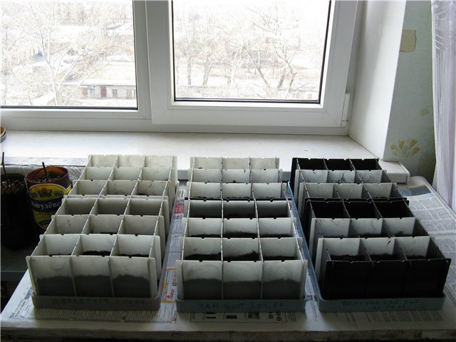 После полива по поверхности питательной смеси, она оседает и немного уплотняется. Раскладываю семена по поверхности, не заглубляя, и присыпаю той же сухой, питательной смесью, приблизительно пол сантиметра. Как в природе!!! Семена осыпались осенью на поверхность почвы, а отмершая вегетативная масса растений их накрыла. Всё очень просто и эффективно. Затем наклеиваю напротив ячеек бирочки, под скотч, или пишу несмывающимся маркером название сорта или гибрида.