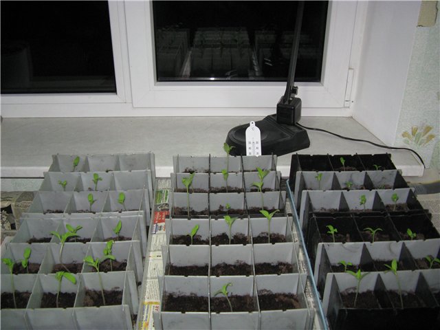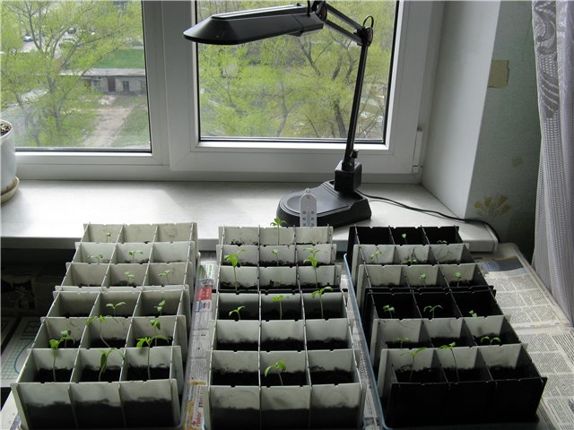 По мере прорастания большего количества семян в каждом ящике вечером снимаю с него газеты и накрываю ими ниже расположенные батареи отопления. Так же поступаю и с остальными рассадными ящиками. Со следующего дня включаю над рассадой настольную лампу, продлевая световой режим.