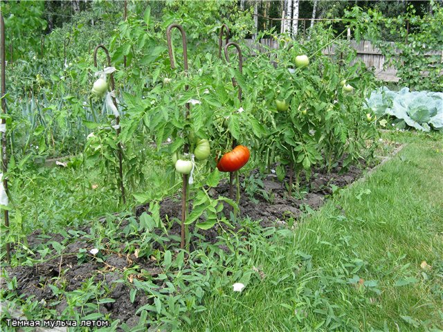 Почему именно тёмная мульча должна лежать поверх других слоев мульчи? Потому что светлая мульча (сухие листья; свежескошенные «сорняки», при высыхании приобретают желтую окраску; древесные опилки, стружка и т. д.) негативно влияют на такую однолетнюю культуру, как ТОМАТ, точнее будет сказать на само растение. Почему пришёл к такому выводу?