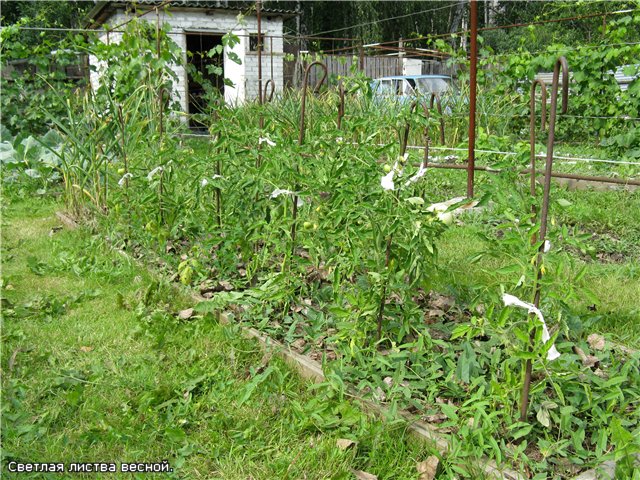 Высаживая рассаду этого вкусного овоща в делянки, обратил внимание на то, что в делянках с прошлогодней, утрамбованной, полуперепревшей, тёмной листвой, растения имеют тёмно-зелёный цвет стеблей и листьев, как это и положено. Напротив, в делянках, мульчированных весной сухой листвой, растения бледные и хилые, как - будто им не хватает солнца, хотя вся дача открыта солнцу весь световой день.