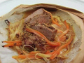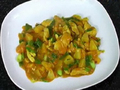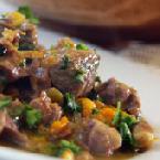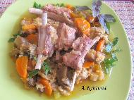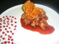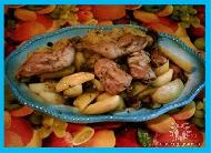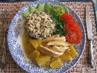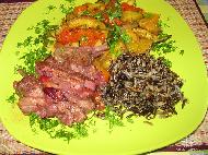 Баранина в кисло-сладком соусе с овощами и диким рисом.