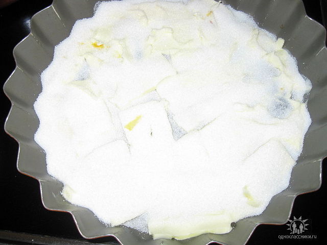 На дно формы укладываем сливочное масло 100г., на него насыпаем сахарный песок -1 стакан, укладываем персики и сливы.
