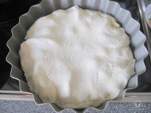 Дальше закрываем слоеным тестом( у меня готовое), ставим в разогретую духовку примерно на 40-50 мин, как подрумянится.