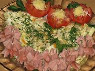 Украсила кружочками помидора, посыпала тертым сыром и кунжутными  семечками.