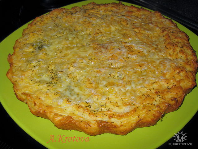 Замесить тесто из всего перечисленного, кроме сыра, выложить в форму, смазанную маслом, выпекать до румяной корочки, примерно 35минут, затем сверху посыпать тертым сыром и поставить в духовку еще на 15 минут.