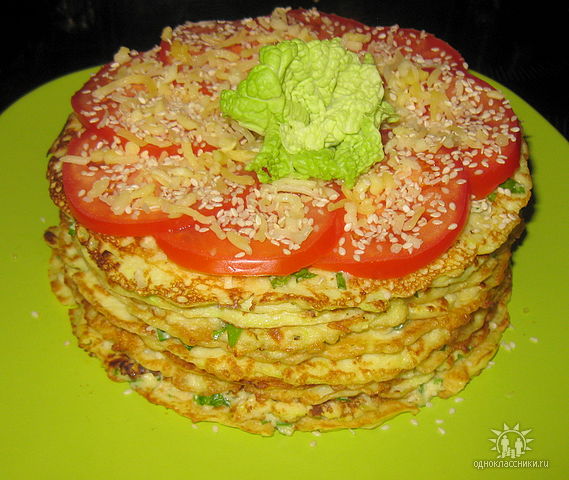 Рецепт тот же, что и пирог из цукини, только в тесто добавила рубленную зелень, а вместо соли - приправу вегета. Сверху на тесто посыпала кунжутные семечки