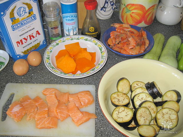 Королевские креветки, семга, кабачки, баклажаны,тыква, сладкий перец в кляре.