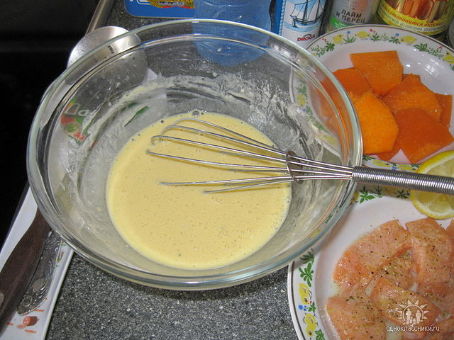 Готовим кляр - взбиваем яйца, муку и воду, добавляем приправу вегета, немного свежемолотого перца.