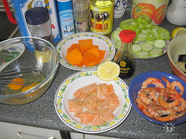 Приготовление; кабачки, баклажаны режем на кружочки, тыкву на небольшие кусочки, перец - колечками. Всё раскладываем в разные тарелочки, солим и перчим.
