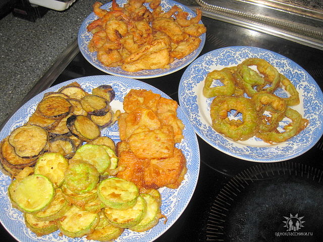 Все подготовленные продукты, обмакиваем в кляр и жарим в большом количестве подсолнечного масла.