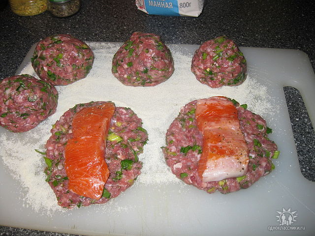 Из фарша делаем лепешечки, и аккуратно заворачиваем начинку - филе форели...формируем котлетку