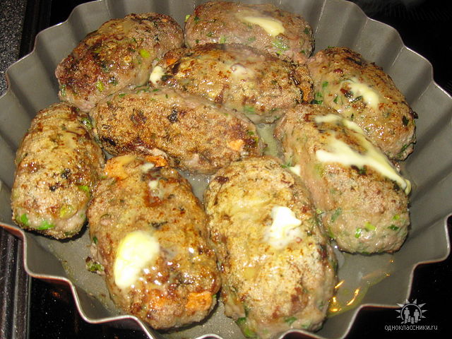 На каждую котлетку положить по кусочку сливочного масла, в сковородку добавить немного воды и поставит в духовку