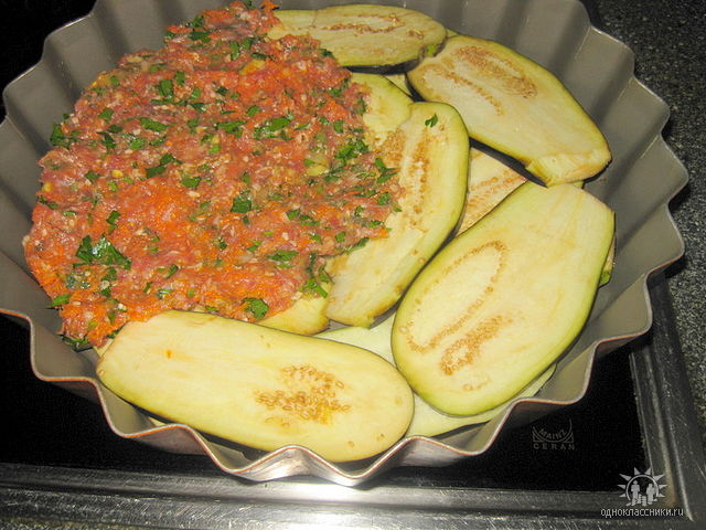 На дно формы наливаем немного растительного масла и укладаваем слоями баклажаны и фарш, тонким слоем.