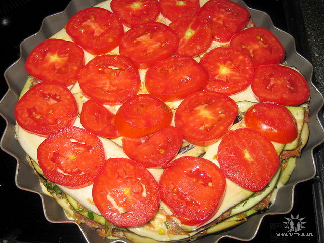 Сверху укладываем кружочки помидоров и ставим в духовку на 40 мин при 200град. Затем вынимаем, засыпаем сверху тертым сыром и еще раз ставим на 30 минут, до готовности.