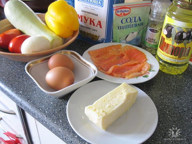 Кабачок трем на крупной терке для корейской моркови, немного посыпаем солью, чтобы пошел сок. Отжимаем лишнюю жидкость, добавляем муку, яйцо, немного соды,гашеной соком лимона - это для теста. Обжариваем лук, укладываем на кабачковое тесто. На лук укладываем мелкопорезанную семгу, сладкий перец и помидоры.