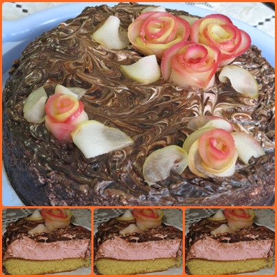 Глазурь: Сахар смешать с какао, добавить сметану. Поставить на огонь. Добавить сливочное масло. Довести до кипения. Выключить и покрыть уже остывший торт готовой глазурью. Немного суфле начало таять под глазурью, поэтому у меня вот такой вот узор. Розочки из яблок.