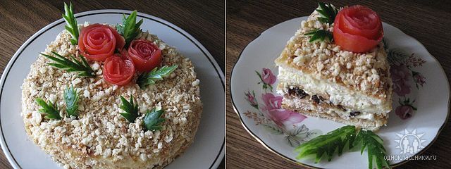 На мой взгляд все продукты, используемые для прослойки, сочетаются, и к ним хорошо подходит чесночек.