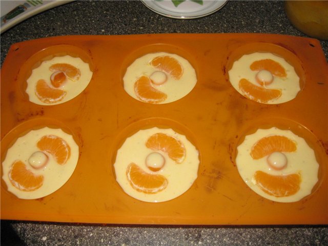 Все ингредиенты хорошо смешать, кроме мандаринов, силиконовые формочки наполнить до половины, и сверху положить по две дольки мандарина. Выпекать в духовке 30-35 минут при t 185.