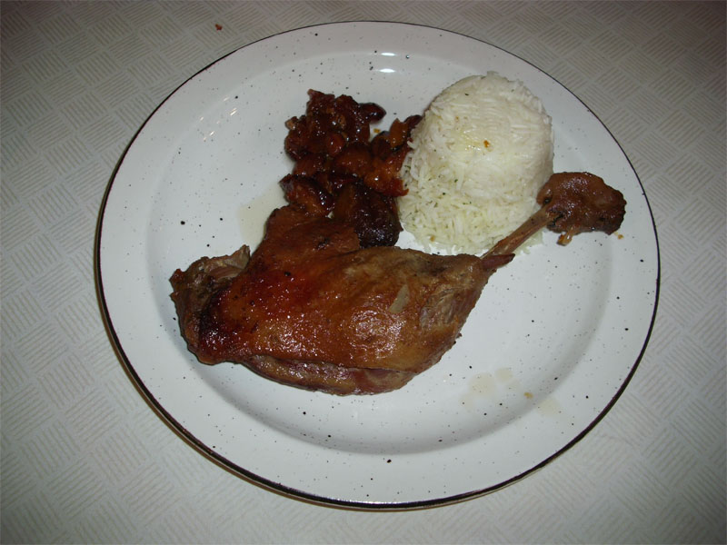 Приготовить маринад, в нём замариновать окорочка минимум на 6 часов и оставить в прохладном месте. Затем добавить абрикосы и миндаль, сложить в утятницу, поставить в духовку и тушить до готовности. Отваренный рис Васмати сложить в небольшую пиалушку, уплотнив ложкой, вывернуть на край тарелки, в середину положить окорочка и обильно полить соусом, образовавшимся в процесе тушения.