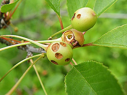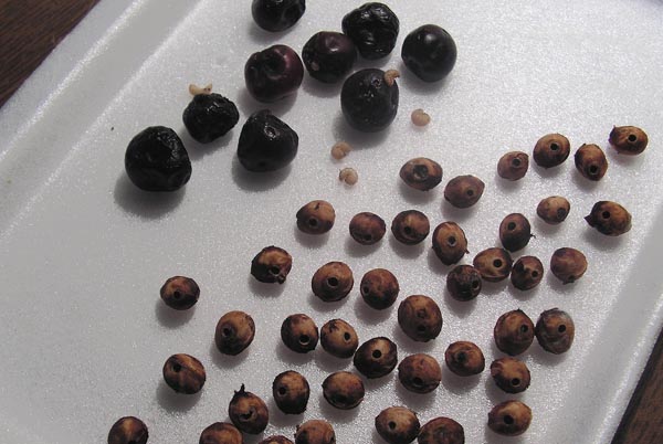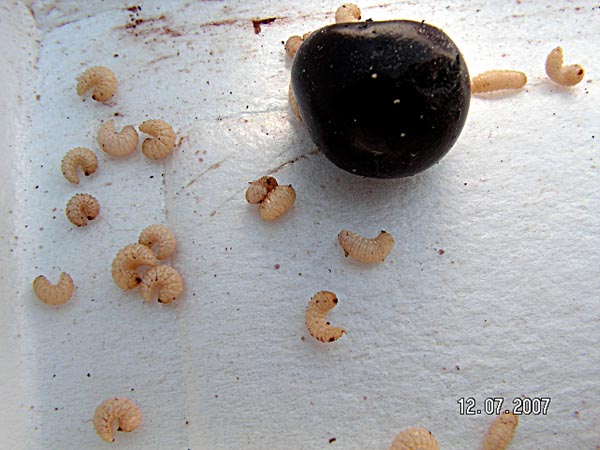 Сильнее всех тогда пострадали самые сладкие плоды сорта Владимирская. Личинки в большом количестве оставались внутри косточек в момент сбора урожая. Поэтому, оборвав вишню, думаю многие, особенно, если ягоды полежали хотя бы одни–двое суток в помещении или в холодильнике, видели на дне емкостей толстеньких желтоватых с маленькой бурой головой безногих личинок. Эти личинки выползли из косточек, сделав их дырявыми. Таким образом, с урожаем часть вредителя была вынесена из садов и погибла. Но довольно большое число поврежденных вишен осыпалось с деревьев на землю, а часть личинок все-таки успела покинуть ягоды до сбора урожая и укрылась в почве.
