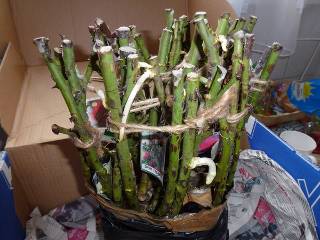 Розы связаны по 10 штук, пробиркованы, верх обрезан для посадки, корни обработаны глиняной болтушкой.