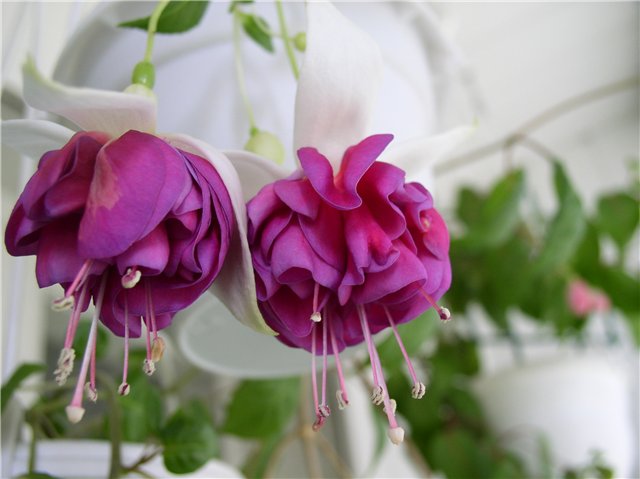 Все сорта фуксий махровые с очень крупными цветами. Многие сорта фуксий имеют просто «гигантские» цветы. Коллекция фуксий очень разнообразна в плане цветовых вариаций.