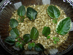 4. Листовые черенки предварительно «купаю» в слабом светло-розовом растворе марганцовки для дезинфекции, укорачиваю черешок листа примерно до 0.5- 1.0 см и погружаю кончик черенка в вермикулит примерно до границы слоёв. При посадке следует учесть, что между листиками необходимо оставить достаточно места для развития будущих деток. Удобно сажать в шахматном порядке. Если лист достаточно крупный и заваливается, не удерживаясь в рыхлом субстрате, то его можно подпереть снизу кусочком не мокнущего материала – например, пенопластом.