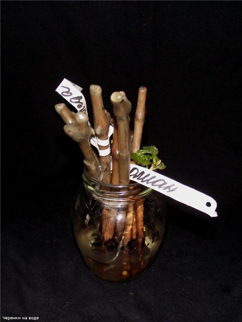 Вот та самая банка, из которой показывал черенки. Так (без подогрева, при комнатной температуре) стоят все банки с прививками новинок - ежедневно, как только корни достигнут 1-2 мм, переселяю из них в землю от десятка до двух черенков. Некоторые прививки спят, а некоторые уже проросли, зачатки кисточек удаляю при пересадке, побеги не прищипываю.