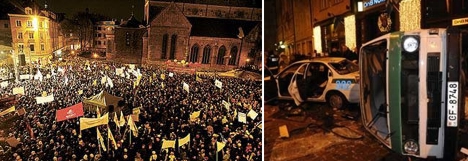 По мере того как Домская площадь стала заполняться, накалилась и обстановка. С криками «Мочить Сейм!» в сторону здания парламента, расположенного неподалеку, отправилась первая группа молодежи, за которой потянулись многие из оставшихся на площади. Среди демонстрантов появились флаги Латвийской ССР и России. После того как в полицию, заблокировавшую подступ к парламенту, полетели камни и бутылки, а в парламенте начали бить окна, силы правопорядка перешли в наступление. К десяти вечера демонстрантов оттеснили от сейма слезоточивым газом и дубинками, и некоторые протестующие, в основном молодежь, решили выказать свое недовольство там, где полиции нет. Погромщики числом в несколько сотен, как специально отмечают корреспонденты агентств, и латышского, и русского происхождения, прошлись по Старой Риге, разбивая витрины магазинов, растаскивая из разгромленных лавок алкоголь, корежа и переворачивая машины. Больше всего пострадали государственные учреждения, в частности министерство финансов, лишившееся стекол. Любопытно, что по решению организаторов митинга если в течение месяца президент Валдис Затлерс не распустит сейм, то его ждет еще более крупная акция, теперь уже по всей стране.